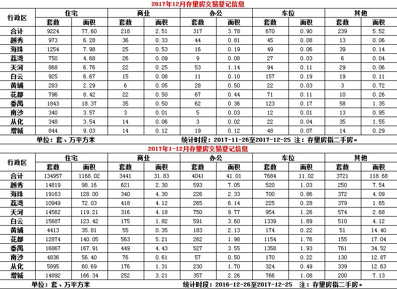 2017年12月份存量房交易登记信息
